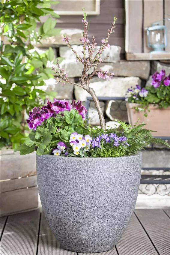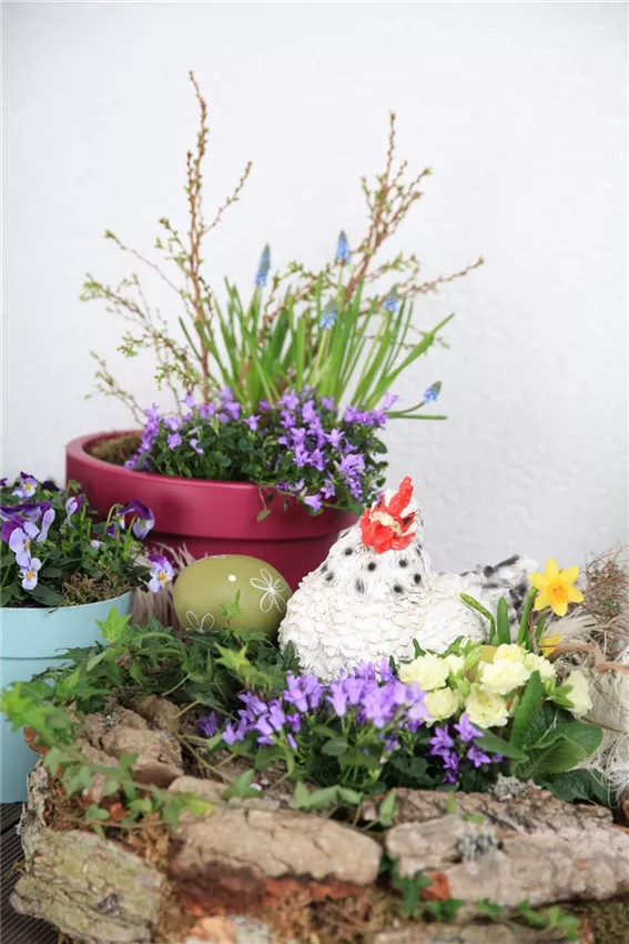 Viola cornuta Sobald etwas mehr Platz gegeben ist, wird die Basis ausgebaut. Man greift zum Schubladenystem, das man selbst aus verschiedenen Kästen zusammenstellt. Dazu kann man Blumenkästen nutzen oder seiner Gestaltungskunst freien Lauf lassen. Hauptsache, es entsteht keine flache Wand, sondern ein Gebilde mit Vorsprüngen und verschiedenen Ebenen. Nun gilt es wieder, das Ganze mit Pflanzen und Dekor zu füllen. Dabei immer bedenken: Fast alles, was es in Groß gibt, kann man auch im Kleinen ziehen. Man greift eben nicht zu Blühern mit Riesenflor, sondern zu reizvollen kleinen Blüten, man zieht keine großen Tomaten, sondern Kirschtomaten, man pflanzt keinen Baum, sondern einen Bonsai. Das Ergebnis ist kreativ und beglückend! Außerdem ohne viel Knien und Bücken, wie es im Garten so oft erforderlich ist.